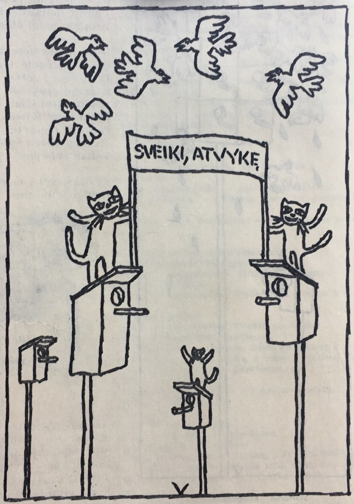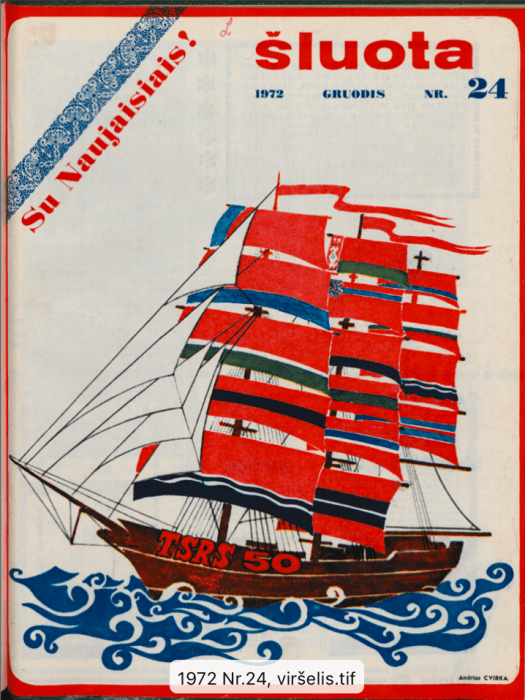 J. Docius, Moon phases. “Šluota,” 1959, Nr. 23, p. 14.Gintautas Survila “Peace to the world, Victory for us!”, 1990, “Šluota,” Nr. 4, p. 3. Jonas Varnas “Welcome”, 1974.
