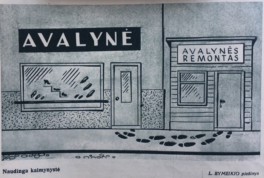 L. Rymeikis “A useful arrangement.” (Shoe shop and shoe repair). “Šluota,” 1959, Nr. 22, p. 6.