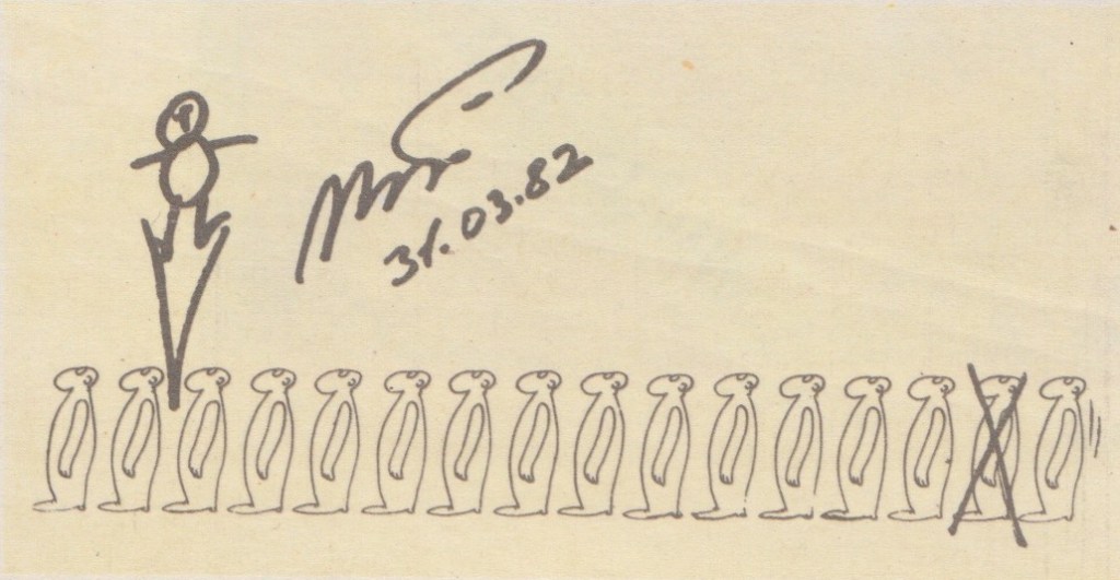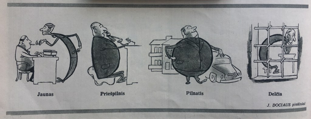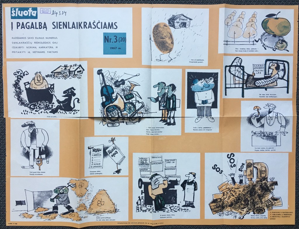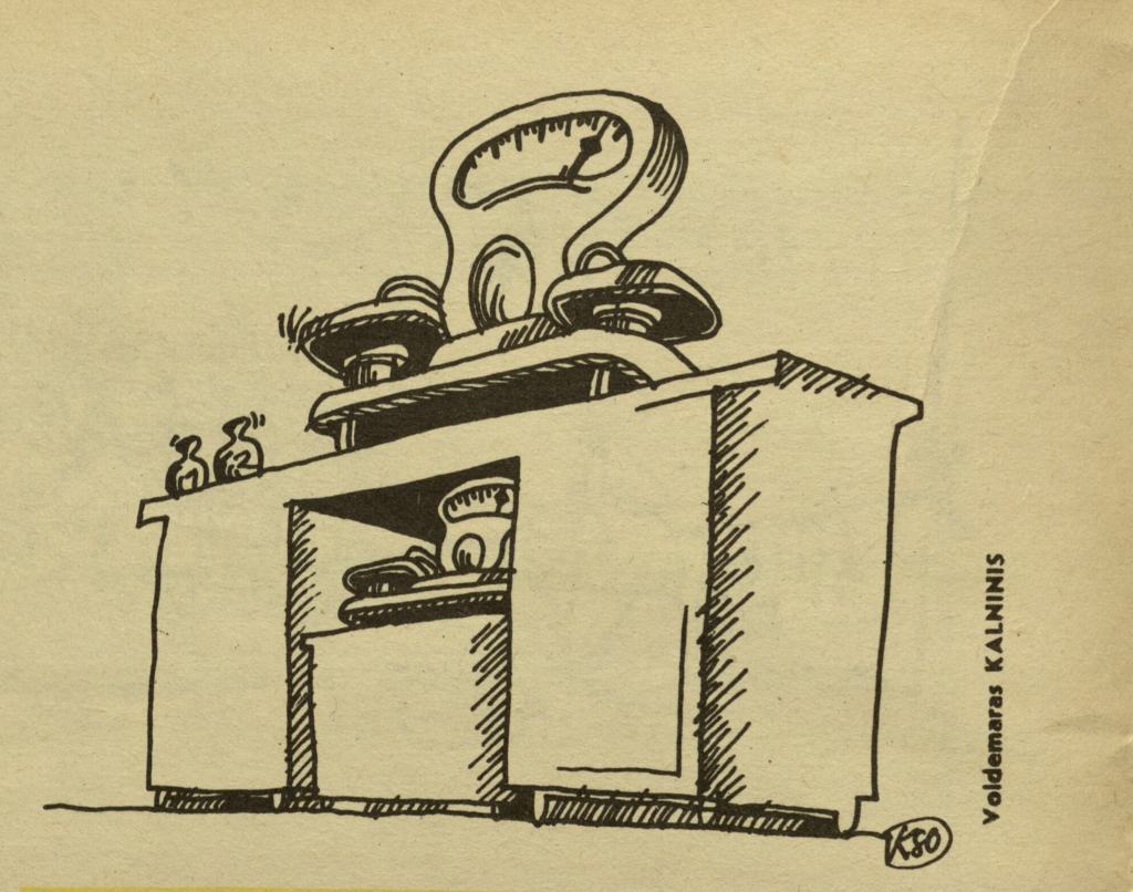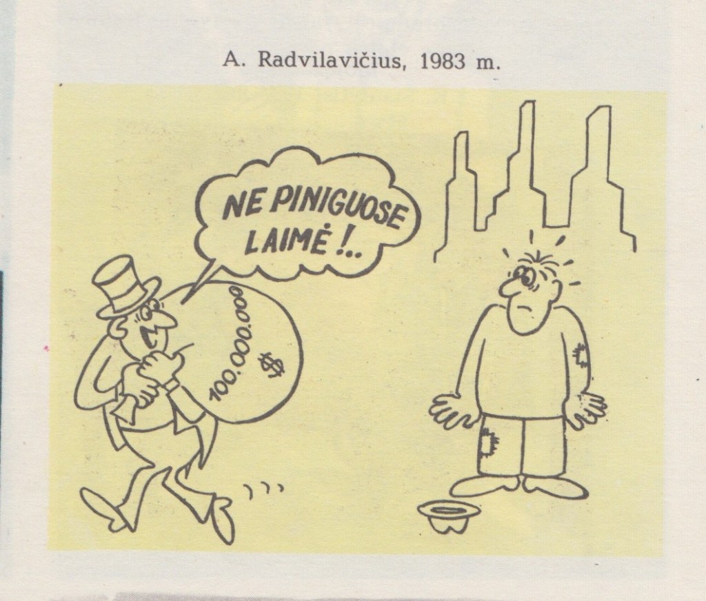 Voldemaras Kalninis “Šluota,” 1981, no. 1, p. 8.Algirdas Radvilavičius, 1983, “Money does not bring happiness!..” Source: “Šluota.” 1984. Juozas Bulota, Arvydas Pakalnis, eds. Vilnius: “Mintis.” P. 100.